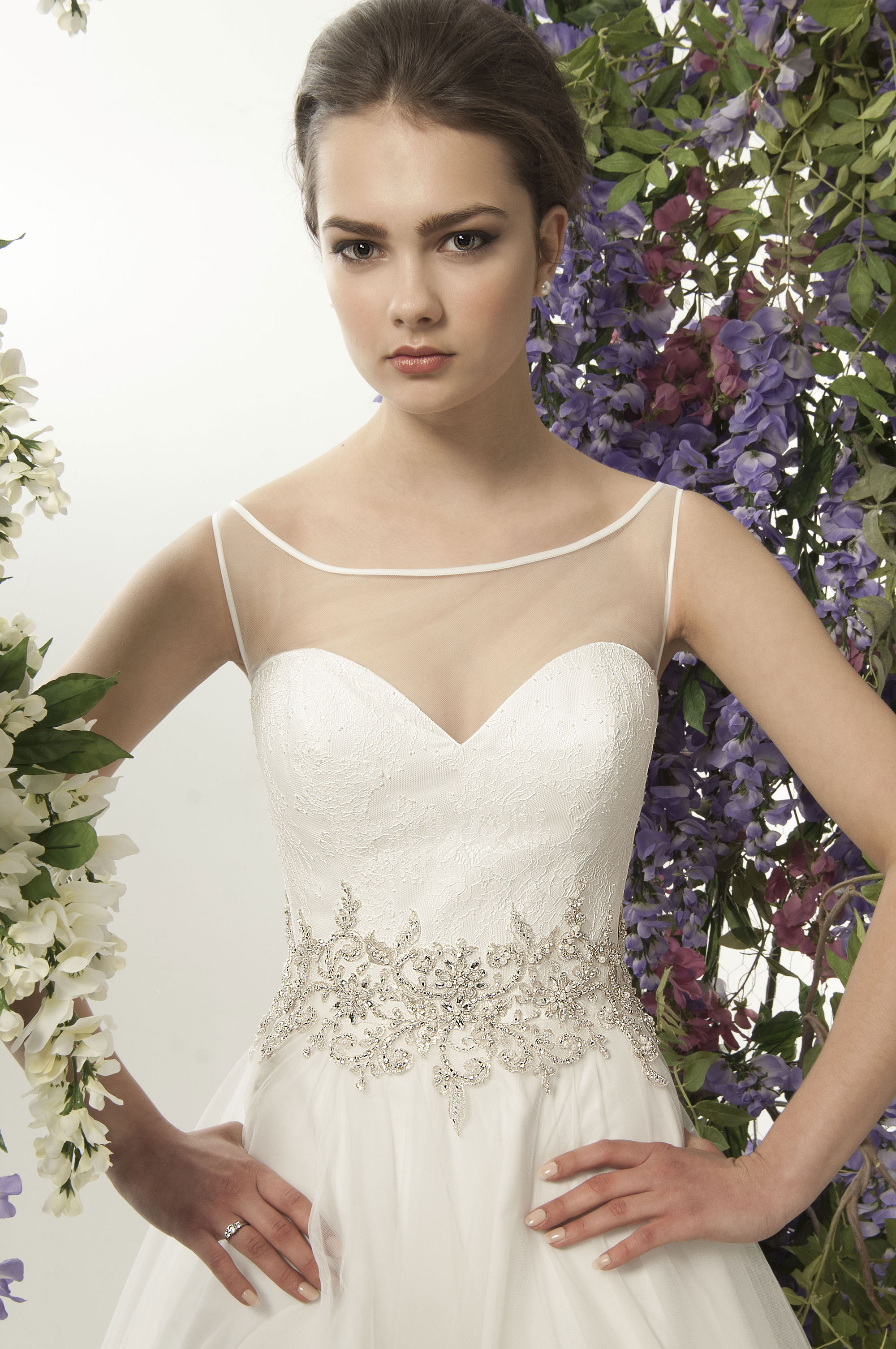 Ginger Rogers Jade Daniels Ball Gown Wedding Dress, Chantilly lace with an illusion neckline in net with English tulle skirt and embroidered metallic lace waist beaded in pearls and crystals