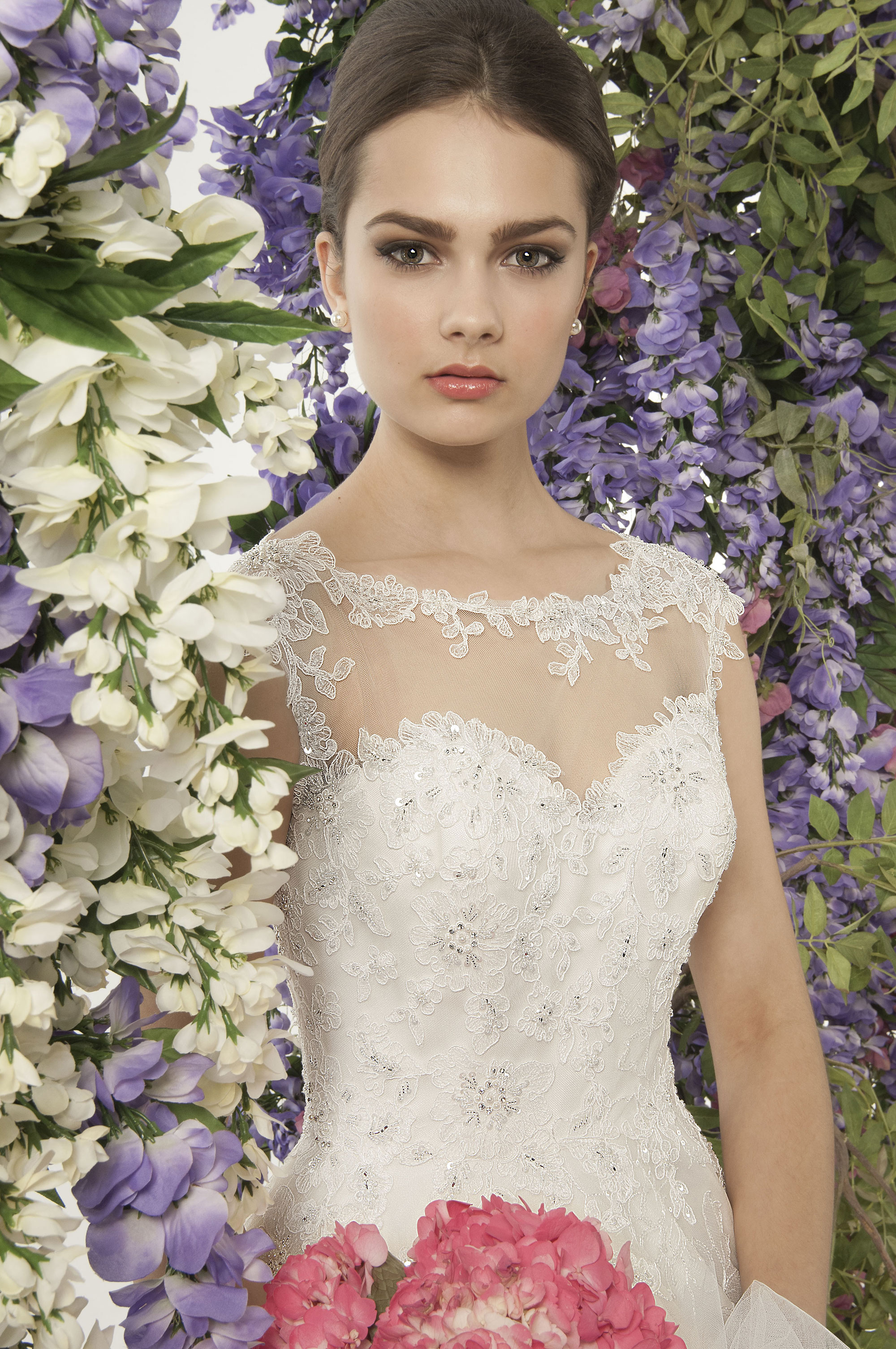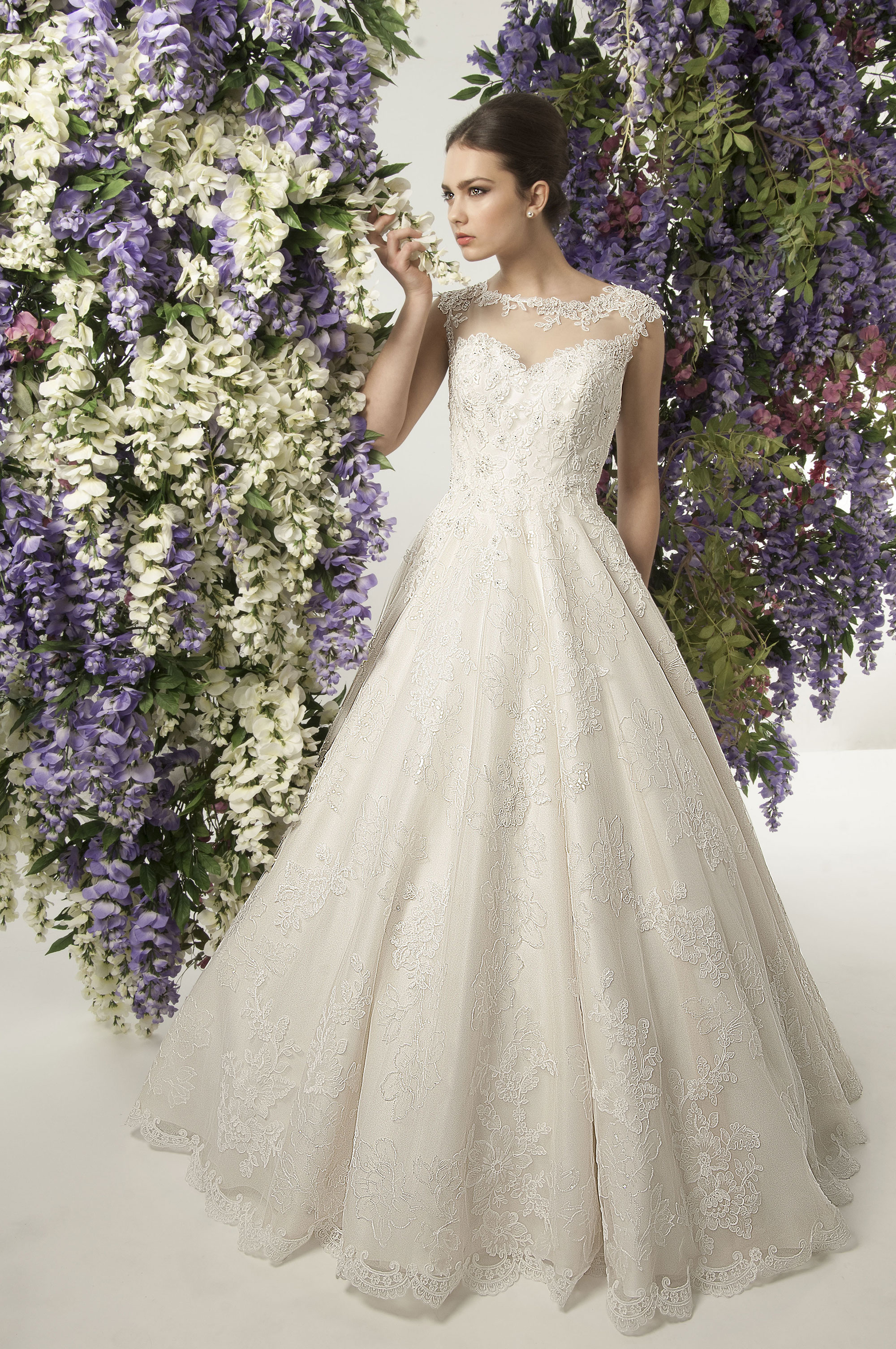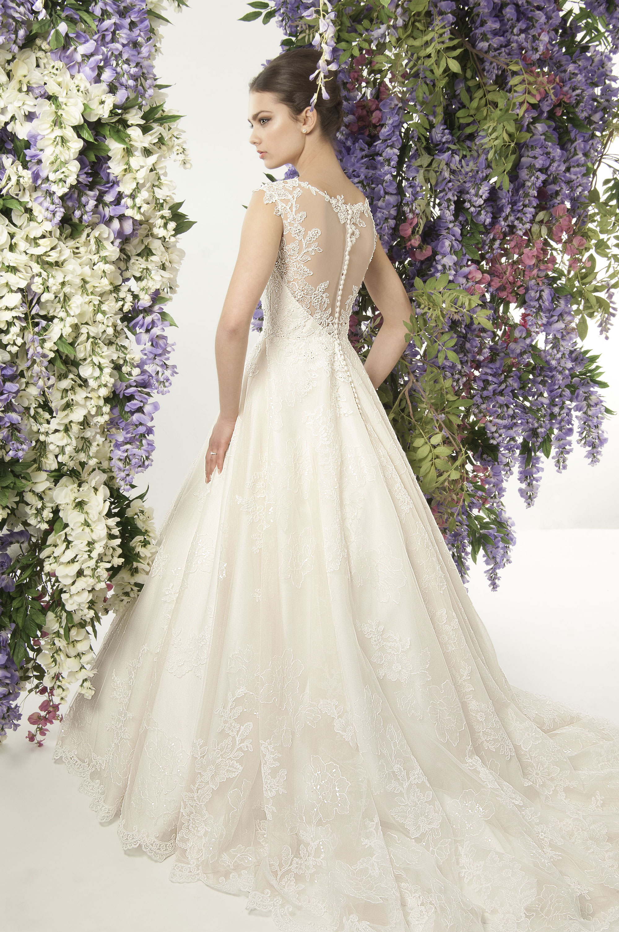 Bette Davis A Line wedding Dress with Embroidered lace on tulle beaded with shimmering sequin and pearls and an illusion ballet back in tulle
