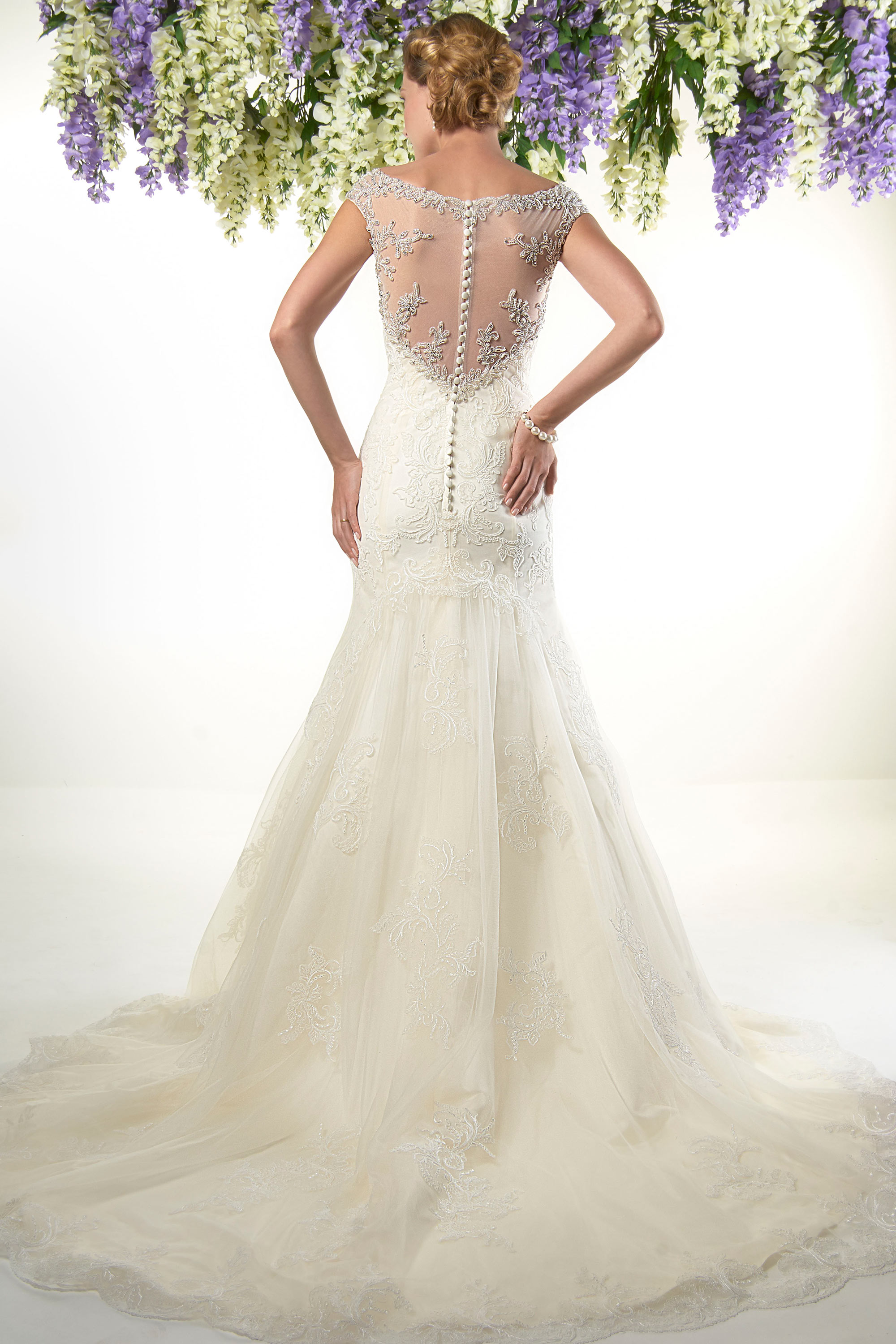 Corded Lace Applique Fit And Flair Skirt With And Illusion Back Delicately Beaded With Vintage Style Beading. Button Fastening Down The Bodice.