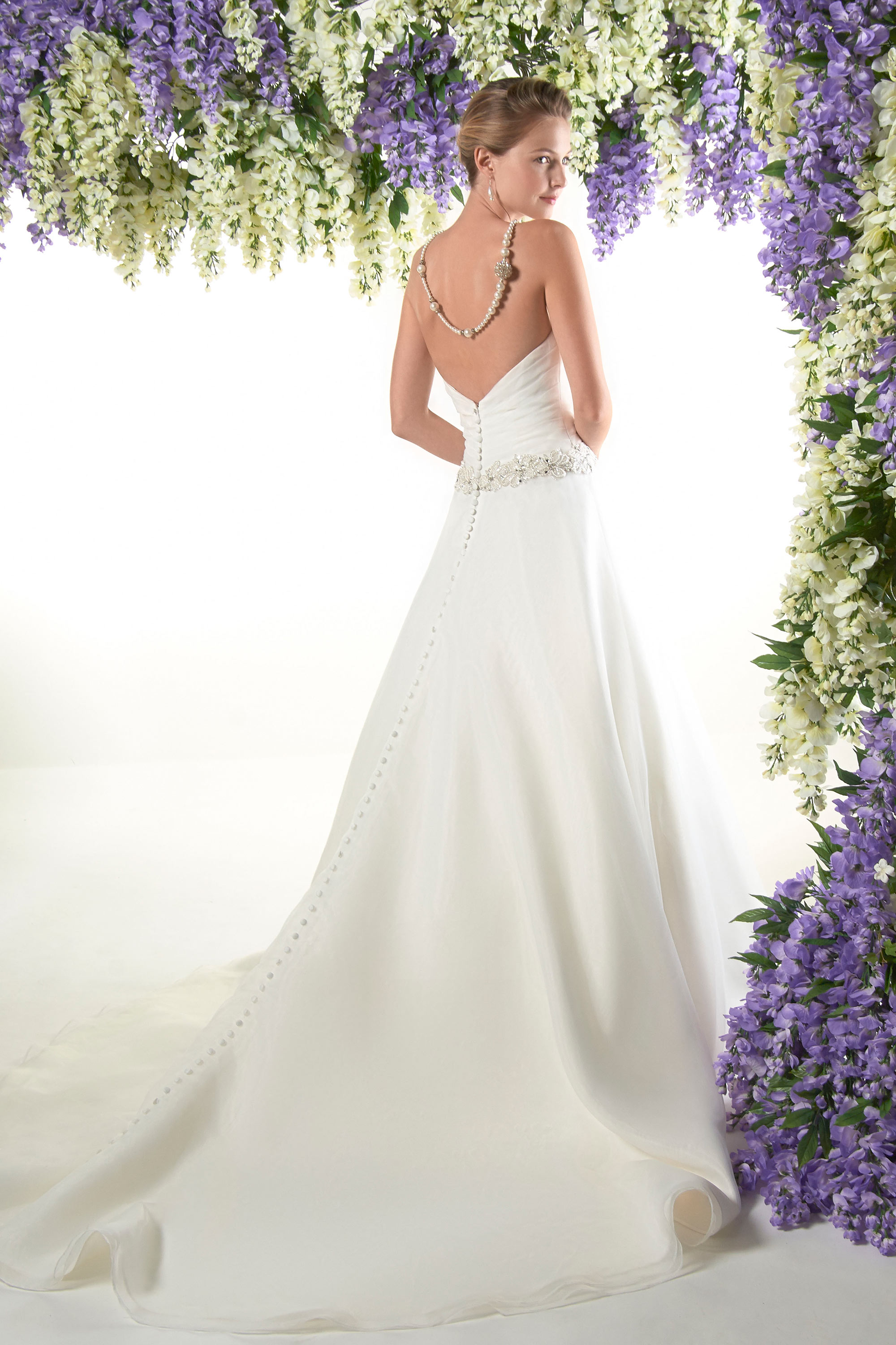 Fitted Pleated Bodice With Sweetheart Neckline And Organza Covered Button To The Hem Of The Train. Pearl And Crystal Beaded Waist Band.