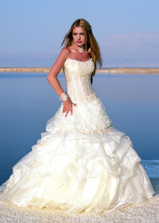 Two pieces hand made My Lady couture Bridal dress. The strapless bodice is a corset decorated with the finest Swarowsky crystals and the skirt is made from the finest organza fabric.